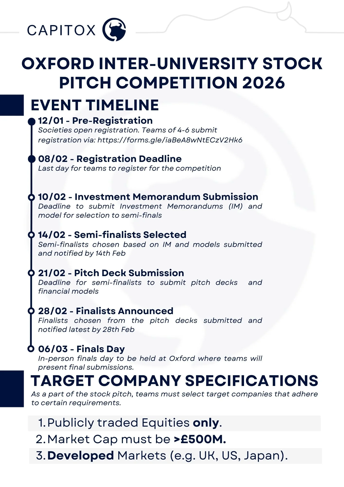 After the success of our invitational competition in 2025, and our various M&A Opens, CapitOx is now welcoming submissions to our 2026 Inter-University Stock Pitch Competition. Designed to bridge the gap between academic theory and practical experience, the stock pitch competition will place teams from around the world against each other, the best of which will be invited to present their investment ideas in person on the 6th of March 2026.